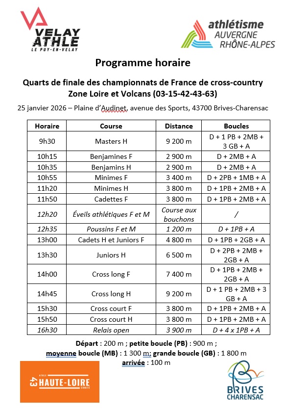Vous devriez également aimer La Corrida du Puy en Velay 2022 ! 28 novembre 2022 Résultats du 15 janvier 2023 : baptême réussi pour le Cross de la Loire Sauvage ! 17 janvier 2023 Cross de Volvic et 10km de Vénissieux 21 novembre 2022 Résultats du 9-10 juillet 2023 : de la piste et du hors stade ! 17 juillet 2023